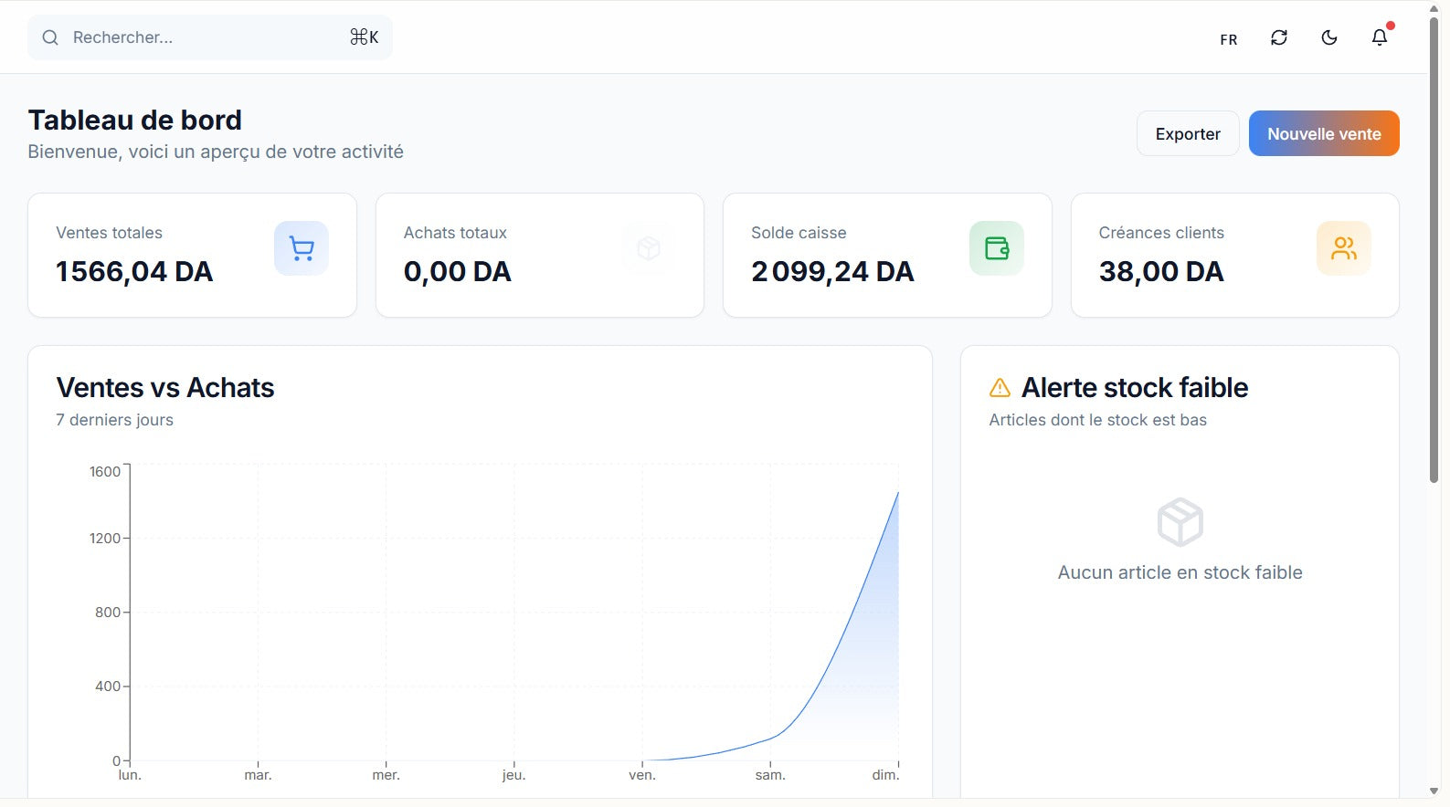 Multi-entrepôts, transferts, réception, stock par emplacement, valorisation en DA, rapports.