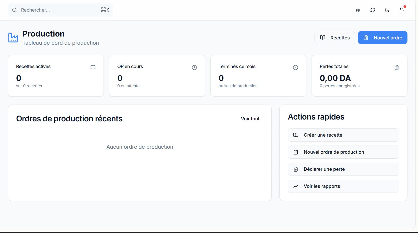 Zones, lots, transferts, historique.