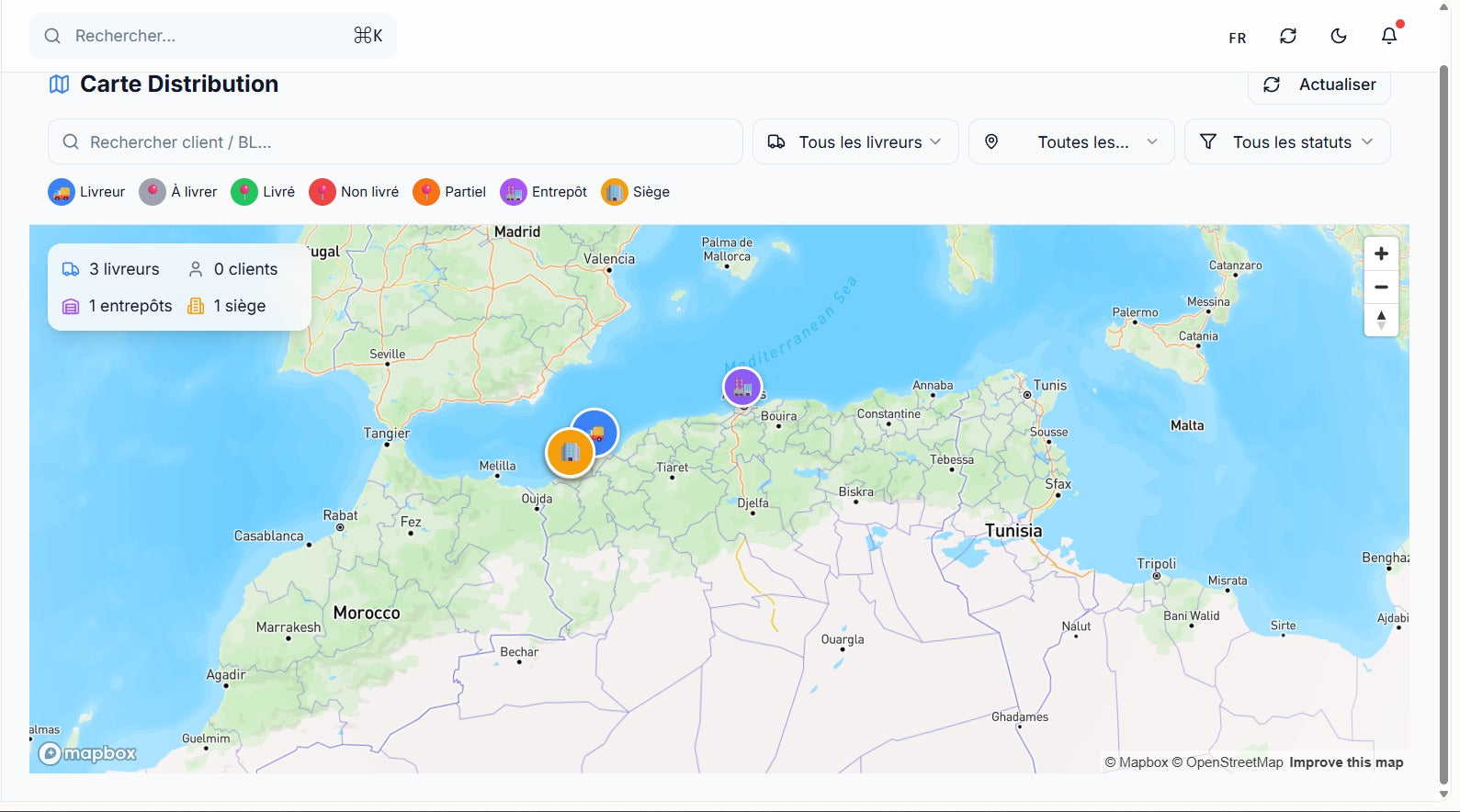 Pins par statut (à livrer/livré/partiel), position livreur, entrepôts + siège visibles.